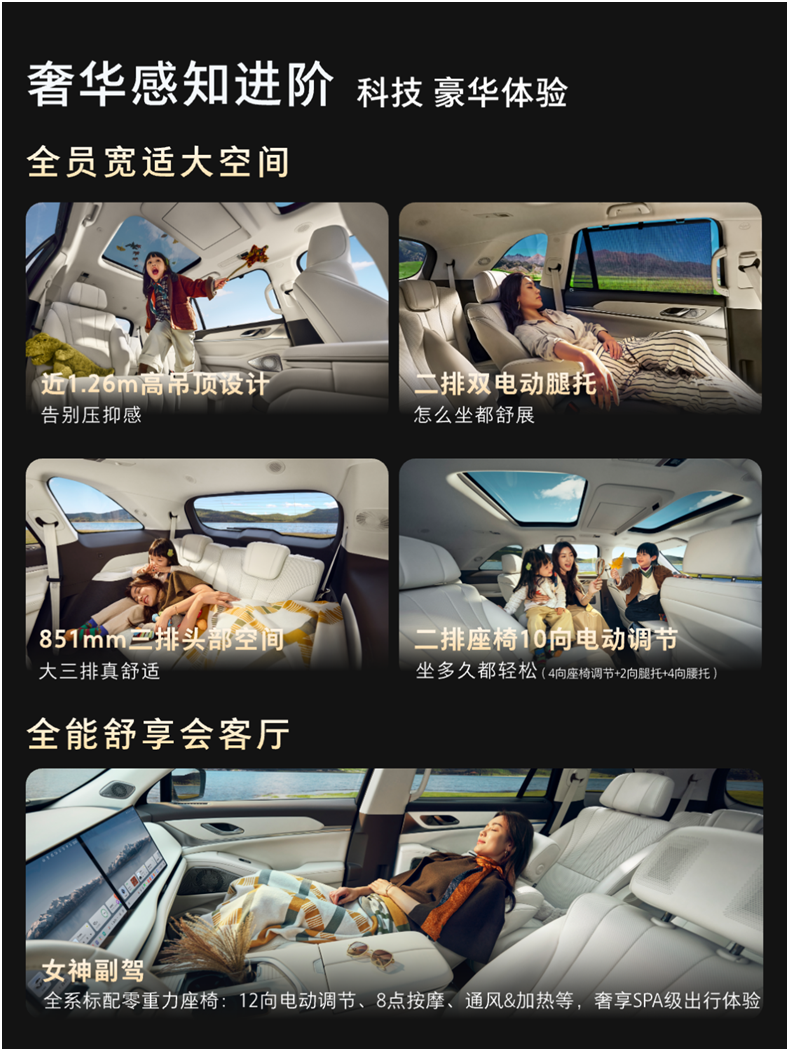 在空間設(shè)計(jì)上,全新藍(lán)山智能進(jìn)階版堅(jiān)持舒適平權(quán)理念。主駕配備八點(diǎn)按摩功能,副駕支持一鍵零重力模式,二排座椅帶有腿托并可一鍵拓展奢侈空間,第三排則確保成人可坐可躺。車內(nèi)還配備了-6℃至50℃的7L豪華大冰箱,將實(shí)用關(guān)懷融入每一處細(xì)節(jié),讓豪華成為全家共享的日常體驗(yàn)。