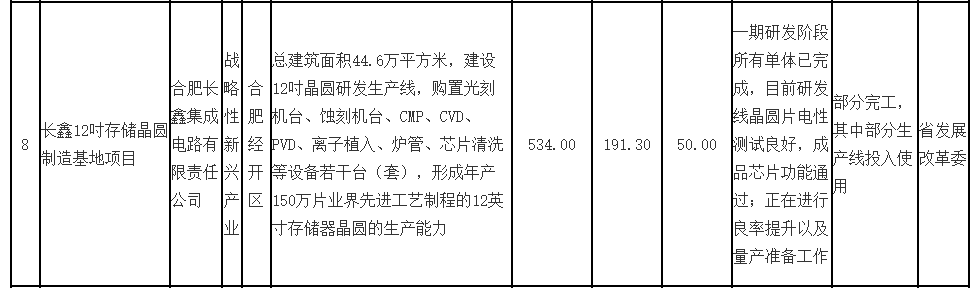 日前,安徽省人民政法辦公廳印發(fā)《2019年省級(jí)調(diào)度重大項(xiàng)目計(jì)劃》,其中透露了長(zhǎng)鑫12吋存儲(chǔ)晶圓制造基地項(xiàng)目等的最新進(jìn)展情況。