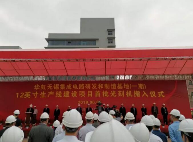 2019年6月6日,華虹無錫集成電路研發(fā)和制造基地(一期)12 英寸生產(chǎn)線建設(shè)項目首批三臺光刻機搬入儀式舉行。光刻設(shè)備的搬入標(biāo)志著華虹無錫基地項目建設(shè)進(jìn)入新的里程,整個項目也隨即達(dá)到新高度。