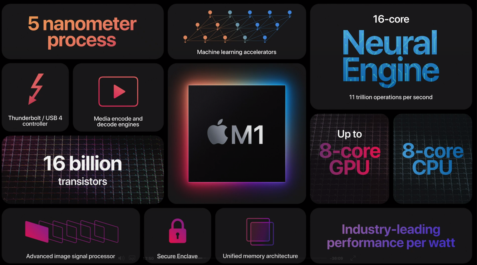 M1芯片是蘋果首款專為Mac打造的芯片,該款芯片采用5納米制程,封裝了160億個(gè)晶體管。將中央處理器、圖形處理器、神經(jīng)網(wǎng)絡(luò)引擎、各種連接功能以及其他眾多組件全部集成在同一塊芯片上,相當(dāng)于在智能手機(jī)上常見的Soc芯片。