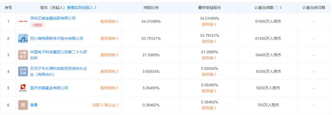 增資完成后,正威金控成為海威華芯第一大股東,持股34.01%,而海特高新則成為第二大股東,持股比例從51.21%降至33.79%。此外,海威華芯的股東還包括中國(guó)電子科技集團(tuán)第二十九研究所(持股21.10%)、國(guó)開(kāi)發(fā)展基金有限公司(持股5.05%)等。