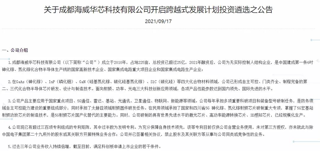 SemiW半導(dǎo)體世界,近日消息,成都海威華芯科技有限公司(以下簡(jiǎn)稱(chēng)“海威華芯”)發(fā)布“開(kāi)啟跨越式發(fā)展計(jì)劃投資遴選之公告”。