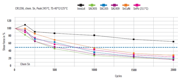 圖7 Innolot™合金焊接C1206陶瓷電阻,TS -40℃/125℃下的剪切強度與其他合金材料對比