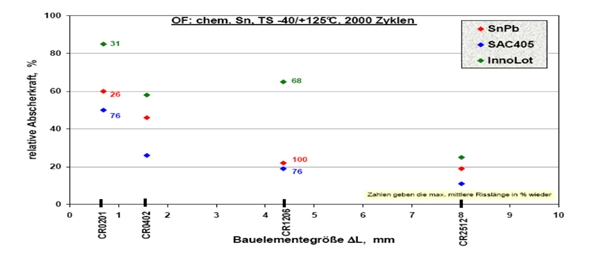 那么,Innolot™合金的焊接強度能有多大幅度的增強呢?通過極限對比其冷熱循環(huán)2000個次數(shù)后 – 目標元件C 1206陶瓷電阻在-40/125℃ TS, Sn基板材料表面測試,其剪切強度的下降幅度,與SnAgCu, SnCuNi, SnPb合金比較(如圖7),以及不同尺寸元件的重復(fù)驗證結(jié)果綜合看(如圖8),Innolot™合金焊接都表現(xiàn)出明顯的優(yōu)勢。