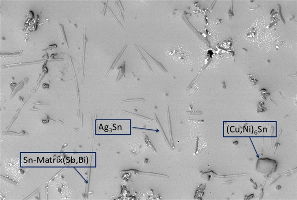 與SAC焊點的金相結(jié)構(gòu)相比,Innolot™合金的焊點的結(jié)構(gòu)被改變了,在Sn-Matrix有Sb 和Bi溶解之中,生成Ag3Sn化合物的同時,不溶于Sn的Ni與Sn形成IMC金屬間的化合物以(Cu,Ni)6Sn5的形式存在,當在更多次循環(huán)時,焊點所受的應(yīng)力能夠被Innolot™有效的緩和,所以合金元素的加入使焊料合金層硬化以提高焊料的抗蠕變性能。