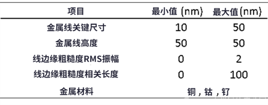 在晶圓廠里,通過改變線關(guān)鍵尺寸和金屬來進(jìn)行線邊緣粗糙度變化實(shí)驗(yàn)很困難,也需要花費(fèi)很多時(shí)間和金錢。由于光刻和刻蝕工藝的變化和限制,在硅晶圓上控制線邊緣粗糙度也很困難。因此,虛擬制造也許是一個(gè)更直接和有效的方法,因?yàn)樗梢?ldquo;虛擬地”生成具有特定線邊緣粗糙度的金屬線結(jié)構(gòu),進(jìn)而計(jì)算出相應(yīng)顯粗糙度條件下金屬的電阻率。圖2(a)顯示了使用虛擬半導(dǎo)體建模平臺(tái) (SEMulator3D®) 模擬金屬線邊緣粗糙度的版圖設(shè)計(jì)。圖2(b)和2(c)顯示了最終的虛擬制造結(jié)構(gòu)及其模擬線邊緣粗糙度的俯視圖和橫截面圖。通過設(shè)置具體的粗糙度振幅(RMS)和相關(guān)長度(噪聲頻率)值,可以在虛擬制造的光刻步驟中直接修改線邊緣粗糙度。圖2(d)顯示了不同線邊緣粗糙度條件的簡單實(shí)驗(yàn)。圖中不同RMS振幅和相關(guān)長度設(shè)置條件下,金屬的線邊緣展示出了不同的粗糙度。這些數(shù)據(jù)由SEMulator3D的虛擬實(shí)驗(yàn)仿真生成。為了系統(tǒng)地研究不同的關(guān)鍵尺寸和材料及線邊緣粗糙度對金屬線電阻的影響,使用了表1所示的實(shí)驗(yàn)條件進(jìn)行結(jié)構(gòu)建模,然后從相應(yīng)結(jié)構(gòu)中提取相應(yīng)條件下的金屬線電阻。需要說明的是,為了使實(shí)驗(yàn)更為簡單,模擬這些結(jié)構(gòu)時(shí)沒有將內(nèi)襯材料納入考慮。