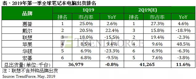 排名第四的蘋果雖然近幾年在筆記本電腦市場的表現(xiàn)并不出色,但第一季的出貨量卻比去年同期提升約10%,達315萬臺,主要原因是受到2018年底CPU缺貨的影響。因蘋果新款筆記本電腦延后上市,氣銷售甜蜜期也隨之延后至2019年第一季。此外,蘋果今年將停產舊款13.3寸Air與15.4寸的Pro,并推出改版13.3寸Air/Pro以及16寸 Pro,預期新版Air有望帶動第二季出貨量成長。
