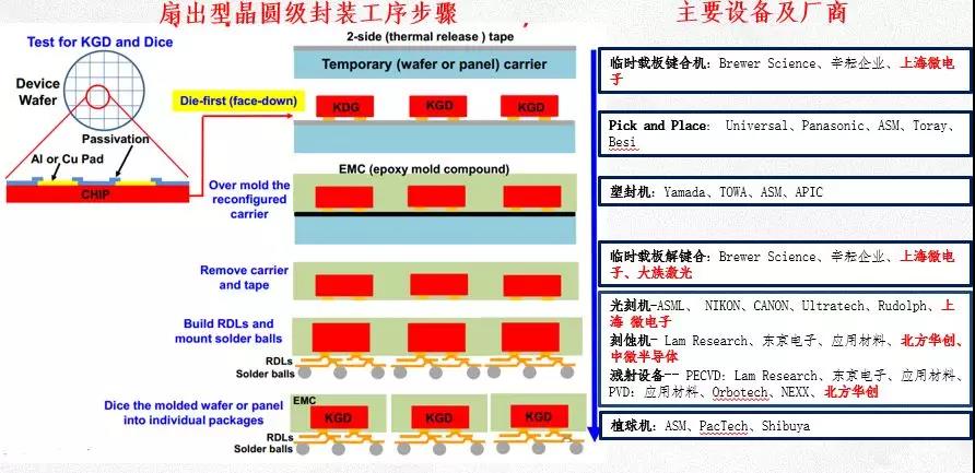 圖表3 扇出型晶圓級(jí)封裝所用設(shè)備及主要廠商