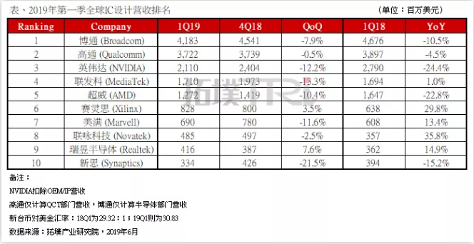 根據(jù)集邦咨詢(TrendForce)旗下拓墣產(chǎn)業(yè)研究院最新統(tǒng)計(jì),2019年第一季全球前十大IC設(shè)計(jì)業(yè)者營(yíng)收及排名出爐,前五名中僅有聯(lián)發(fā)科維持小幅成長(zhǎng),其余包含博通、高通、英偉達(dá)與超威皆出現(xiàn)衰退,其中英偉達(dá)因庫(kù)存尚未完全去化,衰退幅度最大,達(dá)24.4%。