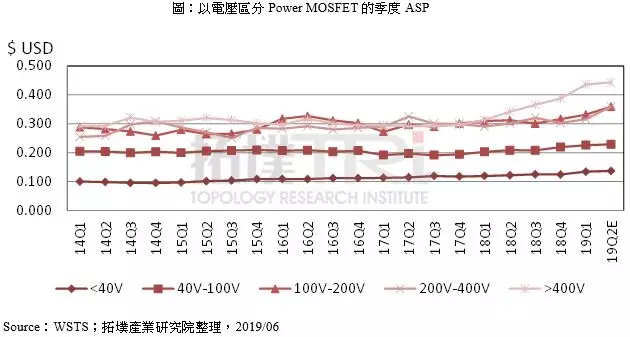 功率半導(dǎo)體在終端產(chǎn)品應(yīng)用愈發(fā)廣泛,尤其近年在車用、5G與高端運(yùn)算等領(lǐng)域話題性高,皆有部分需求屬于高規(guī)格功率MOSFET的應(yīng)用領(lǐng)域,吸引主要IDM大廠積極投入開發(fā)高電壓功率MOSFET(工作電壓范圍>400V)產(chǎn)品,推升平均售價(jià)大幅度成長,位居價(jià)格帶首位。