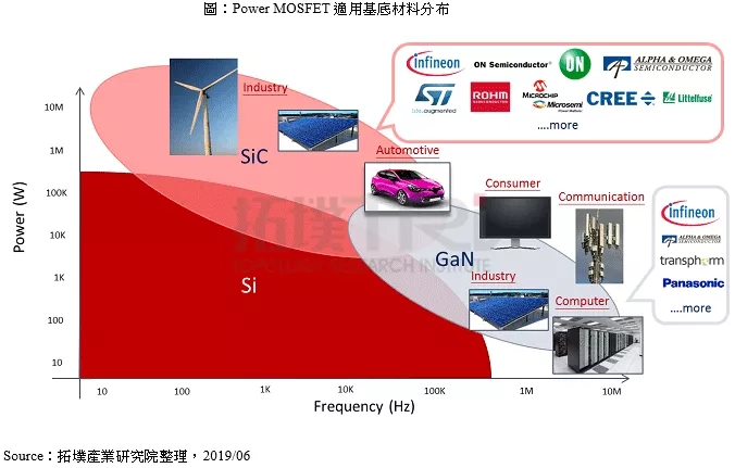 為因應(yīng)高電壓功率MOSFET市場與技術(shù)需求,其中一項(xiàng)發(fā)展重點(diǎn)是寬能隙化合物半導(dǎo)體應(yīng)用,其使用的基底材料朝向以GaN及SiC等化合物半導(dǎo)體材料為主,能達(dá)成在高功率與高切換頻率需求。在主要供應(yīng)鏈廠商中,Infineon、On Semiconductor、STM、ROHM、AOS、Cree等積極開發(fā)使用SiC的功率MOSFET元件,除歐美日大廠外,陸系廠商比亞迪、臺系廠商強(qiáng)茂也積極開發(fā)SiC 功率MOSFET產(chǎn)品。