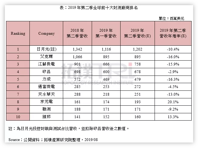 根據(jù)集邦咨詢旗下拓墣產(chǎn)業(yè)研究院最新統(tǒng)計(jì),全球前十大封測(cè)廠商2019年第二季營(yíng)收排名出爐。