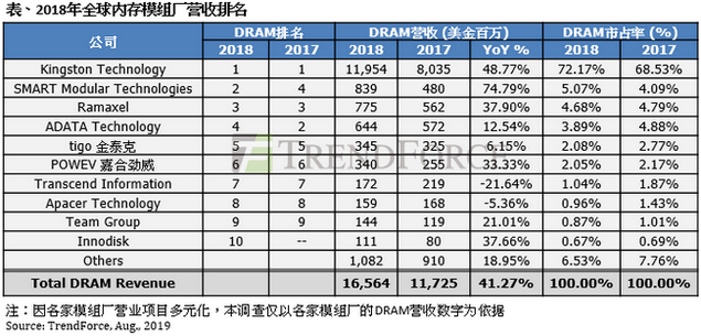 2018年金士頓蟬聯(lián)模組廠龍頭寶座,在DRAM量?jī)r(jià)齊揚(yáng)的帶動(dòng)下,金士頓DRAM營(yíng)收年成長(zhǎng)近5成,再創(chuàng)歷史新高。除了有效管控成本外,金士頓在中國(guó)市場(chǎng)多有斬獲,推升其市占率來(lái)到72%的新高。