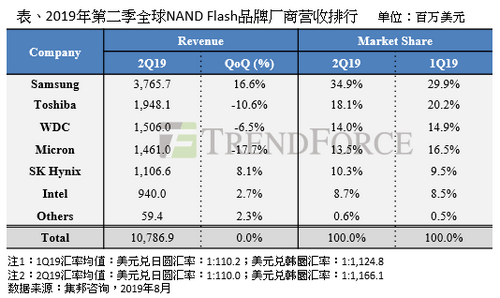 集邦咨詢:價格下跌抵消位元出貨增長,2Q19閃存品牌商營收環(huán)比持平