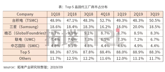 在全球晶圓代工排名上,前五名的晶圓代工廠商囊括晶圓代工產(chǎn)業(yè)88%市占,較2018年同期成長0.8%。第一梯隊(duì)臺積電與Samsung以7nm先進(jìn)制程為主要武器搶占市場分額,遙遙領(lǐng)先其他廠商。