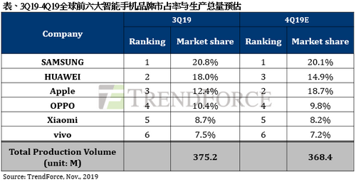 排名第三的蘋果擺脫銷售淡季的陰霾,第三季生產(chǎn)數(shù)量來到4,670萬支,季增幅高達(dá)42%,為本季之冠。蘋果在iPhone 11系列上有不少突破,除了海外新定價(jià)策略以及舊換新等政策外,背蓋新色、三鏡頭、攝像質(zhì)量大幅提升、電池續(xù)航力優(yōu)化等,均有助其全球銷量成長(zhǎng)。展望第四季,受惠新機(jī)持續(xù)熱銷,生產(chǎn)總量將來到約6,900萬支的高峰,預(yù)估iPhone 11系列占比將達(dá)77%。