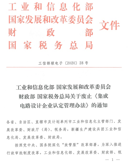SemiUnion報道,3月10日,工信部在網(wǎng)站披露關(guān)于廢止《集成電路設(shè)計企業(yè)認定管理辦法》的通知。根據(jù)通知,按照黨中央、國務(wù)院深化“放管服”改革部署,為深入推進行政審批制度改革,工信部、發(fā)改委、財政部、稅務(wù)總局決定廢止《集成電路設(shè)計企業(yè)認定管理辦法》。