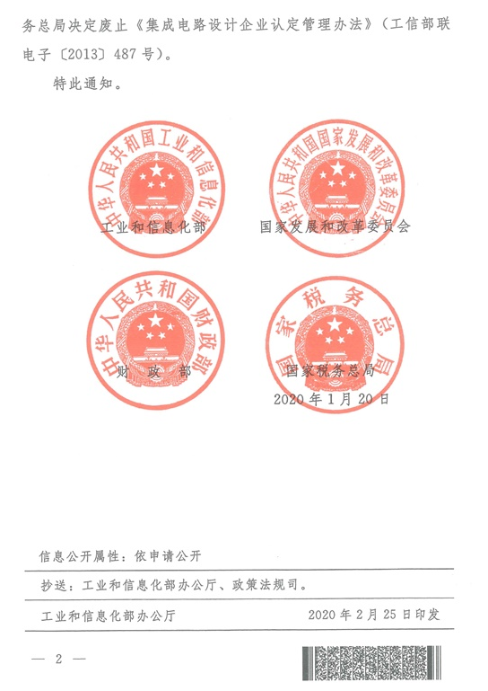 (五)依據(jù)公示情況,工業(yè)和信息化部于申報年度9月底前公布集成電路設(shè)計企業(yè)認定和年審合格企業(yè)名單。企業(yè)認定和年審合格企業(yè)名單及相關(guān)材料抄送國家發(fā)展和改革委員會、財政部、國家稅務(wù)總局。