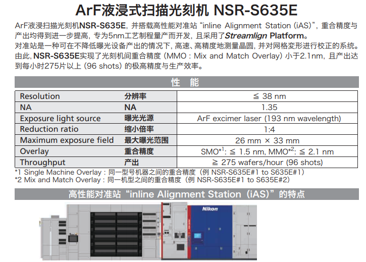 日本企業(yè)尼康方面,官網(wǎng)顯示其最新的光刻機(jī)產(chǎn)品為ArF液浸式掃描光刻機(jī)NSR-S635E,搭載高性能對準(zhǔn)站inline Alignment Station(iAS),曝光光源ArF excimer laser、波長193nm,分辨率≦38nm,官方介紹稱這款光刻機(jī)“專為5nm工藝制程量產(chǎn)而開發(fā)”。