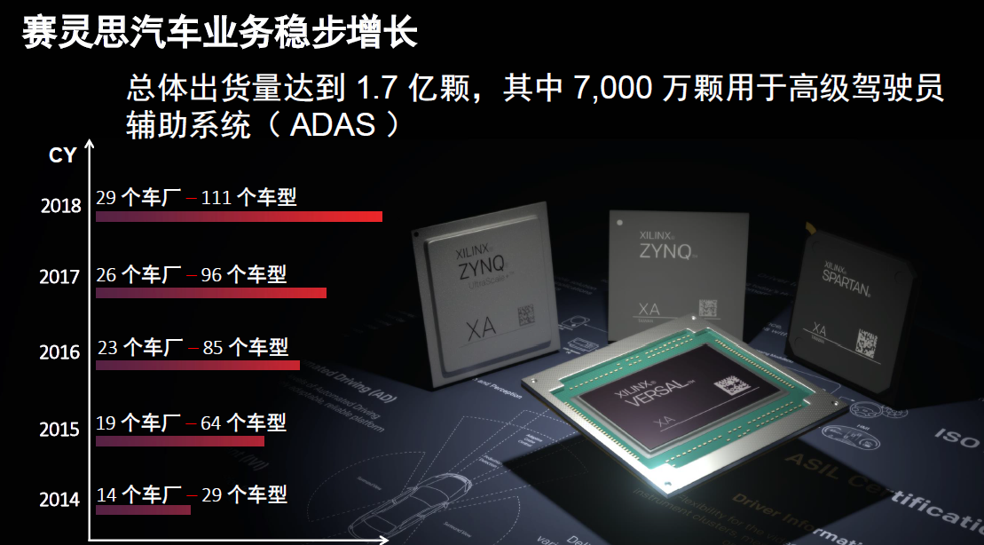 截至目前,賽靈思服務(wù)的車企已超過30家,車型超過 100 款。而賽靈思在汽車領(lǐng)域的合作伙伴則涵蓋了全球所有主流的一級汽車供應(yīng)商、原始設(shè)備制造商(OEM),以及各種初創(chuàng)型企業(yè),車規(guī)級芯片全球范圍內(nèi)累計(jì)銷售已經(jīng)超過1.7億顆,其中7,000萬顆用于量產(chǎn)型 ADAS。