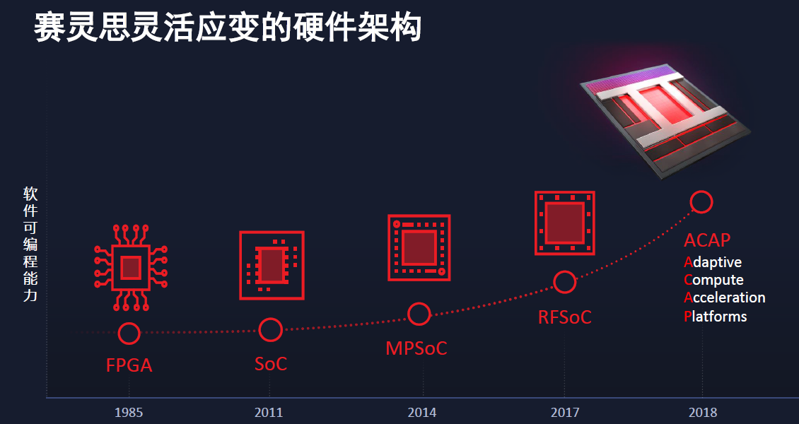 在硬件方面,作為FPGA發(fā)明者,賽靈思并沒有停留于研發(fā)FPGA,而是根據(jù)客戶需求逐漸延展到SoC、MPSoC、RFSoC以及兩年前重磅推出的自適應(yīng)計(jì)算加速平臺(tái)(ACAP)。