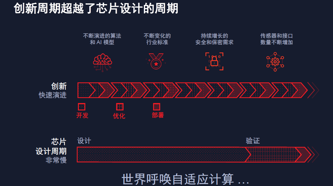 然而,進(jìn)入20nm節(jié)點(diǎn)后,芯片制程的迭代周期越來越慢。隨著數(shù)據(jù)量增加,需求不斷轉(zhuǎn)變,創(chuàng)新正在快速演進(jìn),到智能時(shí)代,算法和AI模型演進(jìn)非常迅速,行業(yè)標(biāo)準(zhǔn)也在持續(xù)變化,致使創(chuàng)新周期與芯片迭代周期不甚匹配。