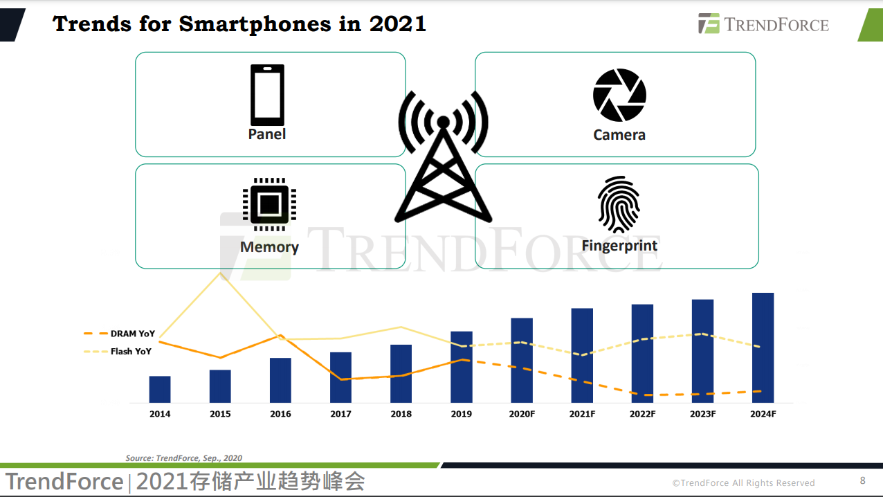 現(xiàn)在手機(jī)基本上都是12GB、16GB的內(nèi)存,再往上增長就會出現(xiàn)浪費(fèi),除非有新的功能或者技術(shù)的出現(xiàn),帶動DRAM的增長。隨著中低端手機(jī)攝像頭的增加,對DRAM也有一定的拉動作用。此外,在另一個存儲部分,存儲速度提升,帶來一些耗電等等方面的影響,今年有LPDDR5的加入,明年還會得到提升。以上四點(diǎn)都和晶圓產(chǎn)能緊缺緊密相關(guān)。