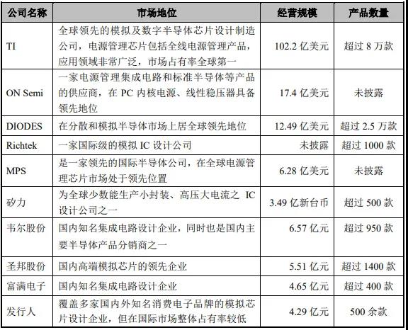根據(jù)力芯微在其招股書中披露的國內(nèi)外競爭對手對比情況,在產(chǎn)品數(shù)量上,德州儀器(TI)擁有超過8萬款模擬芯片產(chǎn)品,其中電源管理芯片覆蓋全線產(chǎn)品,市占率全球第一;而國內(nèi)模擬芯片領(lǐng)先企業(yè)圣邦股份擁有信號鏈和電源管理1400余款在銷售產(chǎn)品,其他廠商如韋爾股份產(chǎn)品數(shù)量超過950款、力芯微產(chǎn)品數(shù)量500余款、富滿電子產(chǎn)品數(shù)量超過400款等。