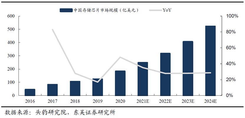 國(guó)產(chǎn)存儲(chǔ)器方面,以長(zhǎng)江存儲(chǔ)和長(zhǎng)鑫存儲(chǔ)為代表的本土存儲(chǔ)器廠商在產(chǎn)品技術(shù)和市場(chǎng)拓展方面持續(xù)突破和大力投入,有望帶動(dòng)國(guó)產(chǎn)存儲(chǔ)器市場(chǎng)加速發(fā)展。根據(jù)頭豹研究院的數(shù)據(jù),2021年中國(guó)存儲(chǔ)器市場(chǎng)規(guī)模達(dá)到248 億美元,同比增長(zhǎng)35.15%。