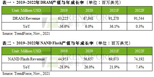 根據(jù)集邦咨詢(xún)(TrendForce)研究預(yù)測(cè),2022年DRAM市場(chǎng)將由供不應(yīng)求轉(zhuǎn)至供過(guò)于求。盡管DRAM價(jià)格將出現(xiàn)下滑,但在寡占市場(chǎng)型態(tài)下,整體產(chǎn)值并不會(huì)大幅下跌,預(yù)估2022年DRAM總產(chǎn)值將達(dá)915.4億美元,年增微幅上升0.3%。NAND Flash方面,2022年NAND Flash價(jià)格也將受供過(guò)于求影響而有所下滑。由于NAND Flash屬完全競(jìng)爭(zhēng)市場(chǎng),均價(jià)下滑的幅度較DRAM更加明顯。然而,NAND Flash在層數(shù)結(jié)構(gòu)的堆棧持續(xù)推進(jìn),供給容量增長(zhǎng)仍維持在30%以上,預(yù)估2022年NAND Flash總產(chǎn)值仍有成長(zhǎng)空間,達(dá)741.9億美元,年增7.4%。