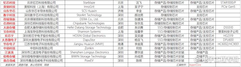 AspenCore分析師團(tuán)隊(duì)根據(jù)全球存儲(chǔ)器市調(diào)機(jī)構(gòu)、各公司官網(wǎng)和網(wǎng)上公開(kāi)信息,以及針對(duì)相關(guān)廠商的問(wèn)卷調(diào)查,匯編整理出30家國(guó)產(chǎn)存儲(chǔ)器及主控芯片廠商的基本信息,詳見(jiàn)下表。