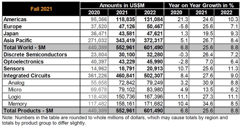 據(jù)世界半導(dǎo)體貿(mào)易統(tǒng)計(jì)組織(WSTS)統(tǒng)計(jì),2021年全球半導(dǎo)體市場(chǎng)相比2020年增長(zhǎng)25.6%,這是自2010年以來(lái)最大的增長(zhǎng),使得2021年全球半導(dǎo)體市場(chǎng)規(guī)模達(dá)到5530億美元。整體半導(dǎo)體市場(chǎng)并沒(méi)有受到疫情的負(fù)面影響,消費(fèi)市場(chǎng)的強(qiáng)勁需求推動(dòng)了半導(dǎo)體主要類(lèi)別普遍超過(guò)10%的增長(zhǎng),其中存儲(chǔ)器增長(zhǎng)高達(dá)34.6%,規(guī)模達(dá)到1581.61億美元。