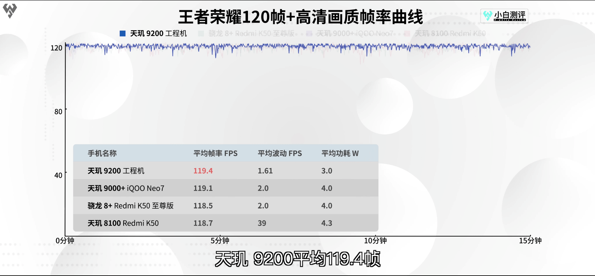其中在《王者榮耀》60、90及120幀測(cè)試中,天璣9200在性能和功耗綜合表現(xiàn)全場(chǎng)極佳,尤其在120幀高清畫質(zhì)測(cè)試中,天璣9200平均幀率為119.4幀,同時(shí)功耗僅為3W。