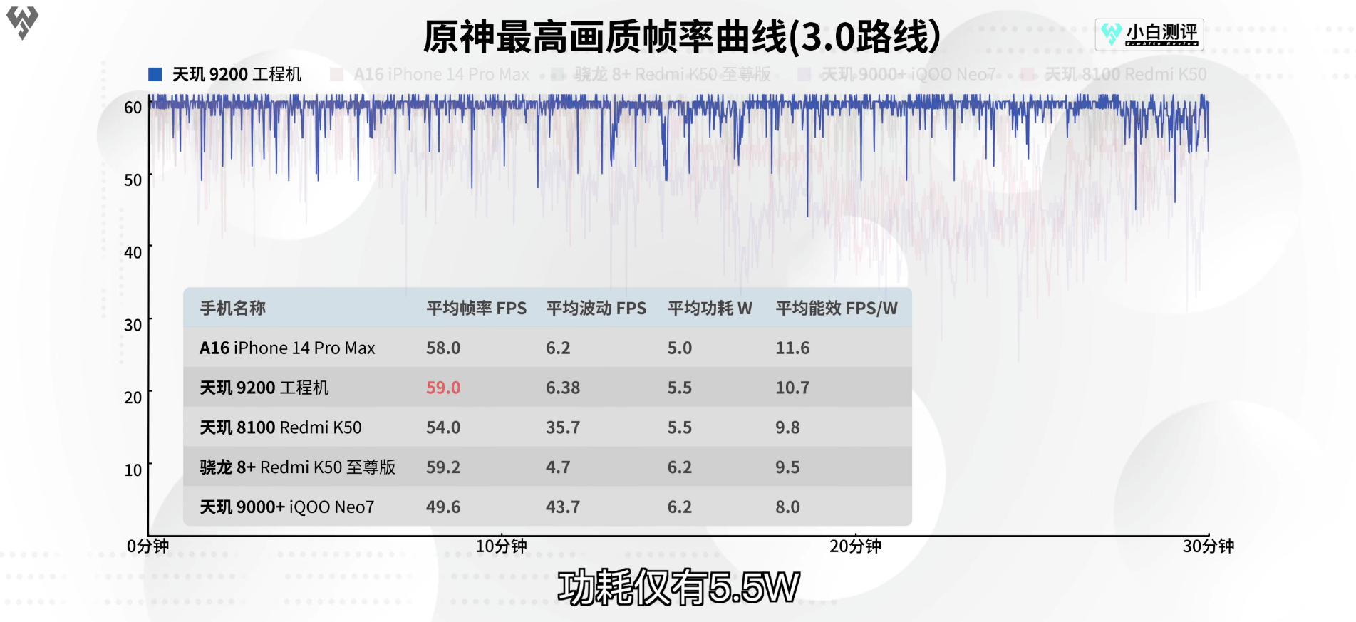 在高負(fù)載的《原神》最高畫質(zhì)測(cè)試中,天璣9200表現(xiàn)依舊拔尖,在接近滿幀的狀態(tài)下,天璣9200平均功耗僅為5.5W,能效比表現(xiàn)安卓第一。