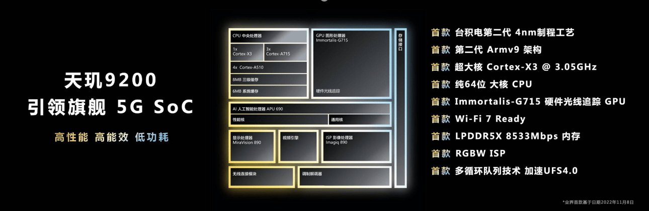 從官方公布的賬面來(lái)看,天璣9200堆料十分下本,采用了臺(tái)積電第二代4nm工藝和第二代Armv9架構(gòu),搭載八核旗艦CPU,包括1個(gè)主頻高達(dá)3.05GHz的Cortex-X3超大核,3個(gè)2.85GHz主頻的Cortex-A715大核,以及4個(gè)1.8GHz主頻的Cortex-A510小核,并且性能核心全部支持純64位應(yīng)用,要知道64位能帶來(lái)更高的能效表現(xiàn),是高端芯片發(fā)展的必然趨勢(shì)。