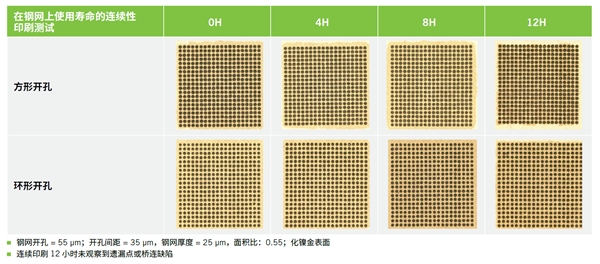 如圖2所示,得益于先進的Welco™制粉技術(shù)以及特殊的助焊劑體系,AP520在鋼網(wǎng)開口尺寸低至55um、開口間距35um的應用上,最長連續(xù)12H的印刷未觀察到遺漏點或者橋連缺陷,表現(xiàn)出了優(yōu)異的印刷穩(wěn)定性;