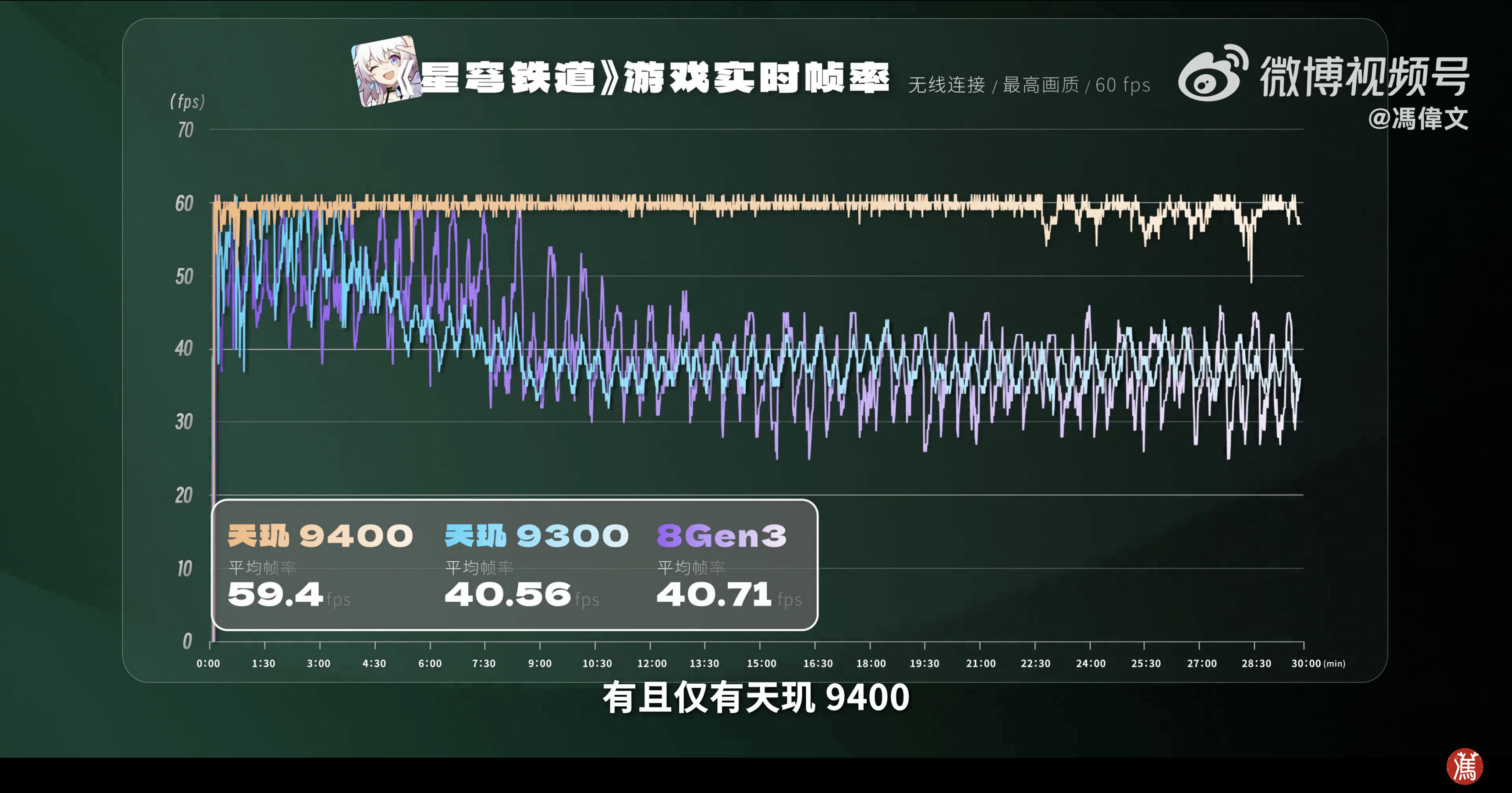 在負(fù)載更高的《崩壞:星穹鐵道》測試中,天璣9300和8G3平均幀率只有40幀左右,天璣9400直接接近滿幀??梢哉f,天璣9400把這三款重載游戲直接征服了。
