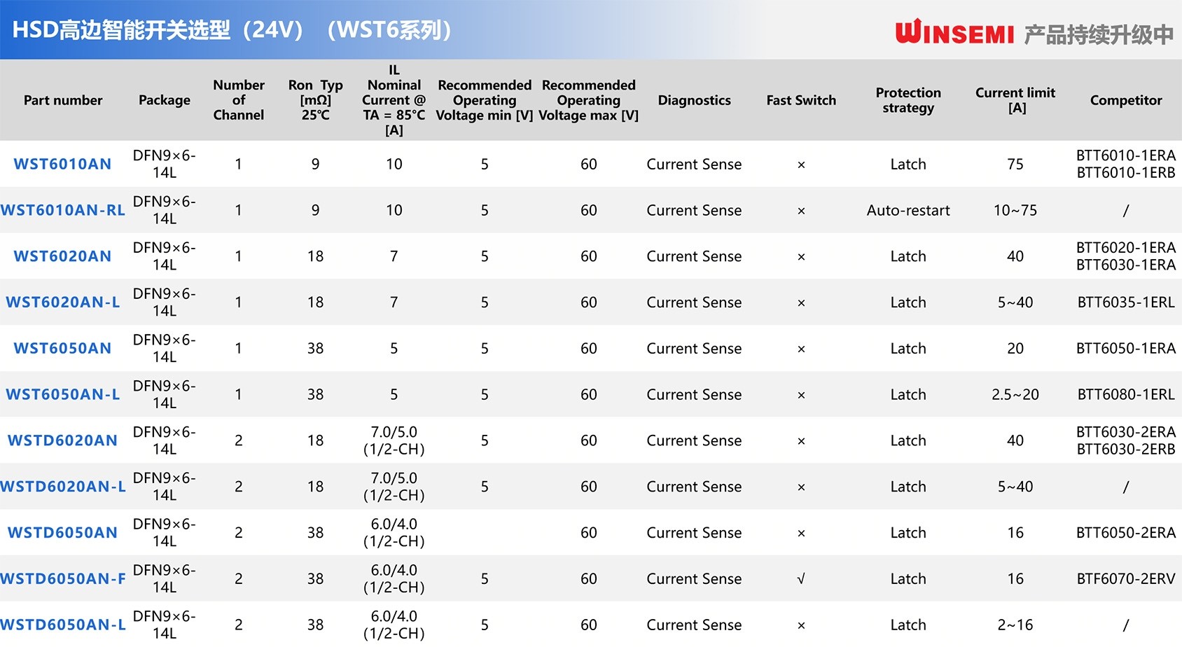 隨著汽車(chē)行業(yè)向智能化、電動(dòng)化和網(wǎng)聯(lián)化加速發(fā)展,傳統(tǒng)12V電氣系統(tǒng)因輸出功率有限,難以滿足商用車(chē)、工業(yè)設(shè)備、機(jī)器人及飛機(jī)等多樣化應(yīng)用場(chǎng)景對(duì)功率的日益增長(zhǎng)需求。當(dāng)下,行業(yè)已逐步邁向24V乃至48V系統(tǒng),以適配不斷演進(jìn)的技術(shù)要求與實(shí)際應(yīng)用需求。在此背景下,穩(wěn)先微電子有限公司重磅推出WST6系列和WST5系列智能高邊開(kāi)關(guān)芯片,專(zhuān)為24/48V電控平臺(tái)設(shè)計(jì),為客戶提供高性能、高可靠性的解決方案。