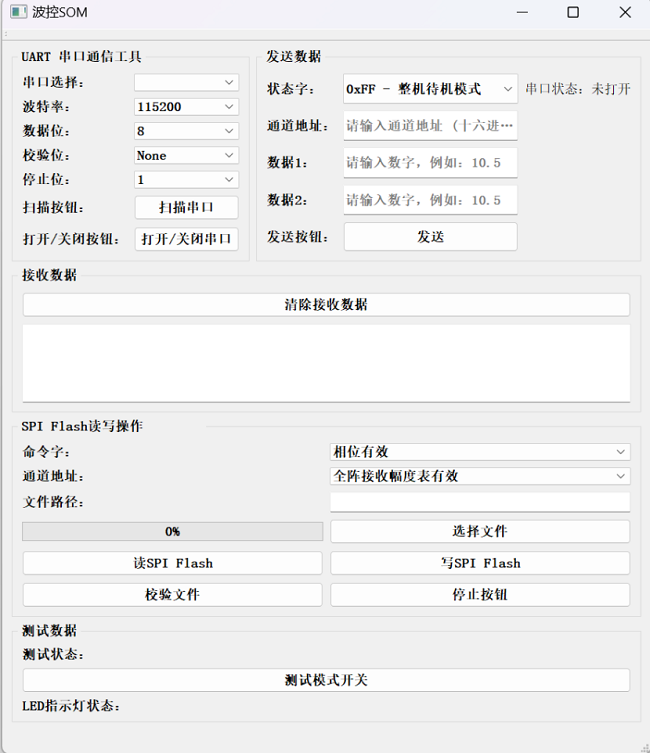 本方案集成了波控處理控制軟件算法,通過波束控制FPGA軟件實(shí)現(xiàn),主要用于接收信號(hào)處理機(jī)的工作模式控制信號(hào)、T/R控制、LD加載控制信息、數(shù)據(jù)加載和波束指向控制信號(hào),完成對(duì)相控陣天線接收通道校準(zhǔn)、發(fā)射通道校準(zhǔn)、補(bǔ)償表加載、波束指向控制、T/R開關(guān)切換等功能。本方案配有上位機(jī)軟件,方便開發(fā)人員驗(yàn)證使用,實(shí)現(xiàn)模擬信處通信功能、角度補(bǔ)償Flash讀寫及模擬TR組件通信功能。