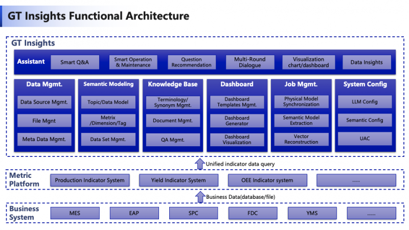 在系統(tǒng)集成層面,GT Insights提供“主駕”與“副駕”兩種模式。既可作為獨立的分析平臺直接使用,也能以插件形式嵌入到MES、YMS等現(xiàn)有業(yè)務系統(tǒng)中,用戶在操作業(yè)務界面時可隨時喚出AI助手進行輔助分析,實現(xiàn)“業(yè)務操作即分析”的無縫體驗。