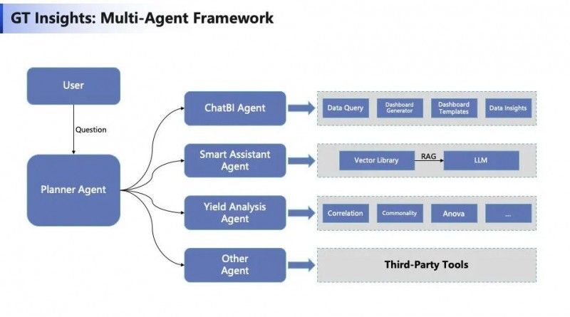 GT Insights的價值不止于單點能力的突破,更在于其作為格創(chuàng)東智CIM AI Foundation的重要組成部分,與它基于格創(chuàng)東智的Octopus AI Agent平臺3.0開發(fā),可通過AI Agent框架,與Planner Agent、Yield Analysis Agent等智能體“數(shù)字員工”協(xié)同工作。從被動響應走向主動規(guī)劃分析路徑、調用第三方工具(如SPC軟件、良率分析插件),形成閉環(huán)的分析決策能力。