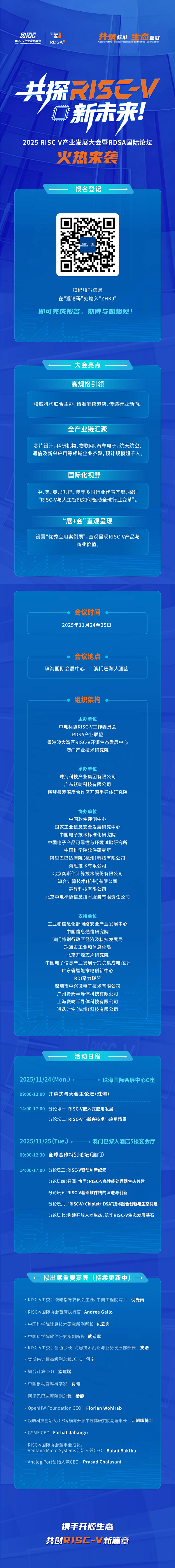 大會(huì)由中電標(biāo)協(xié)RISC-V工作委員會(huì)、RDSA產(chǎn)業(yè)聯(lián)盟、粵港澳大灣區(qū)RISC-V開源生態(tài)發(fā)展中心、澳門產(chǎn)業(yè)技術(shù)研究院聯(lián)合主辦,獲國(guó)家部委及20余家權(quán)威機(jī)構(gòu)鼎力支持,權(quán)威性拉滿!