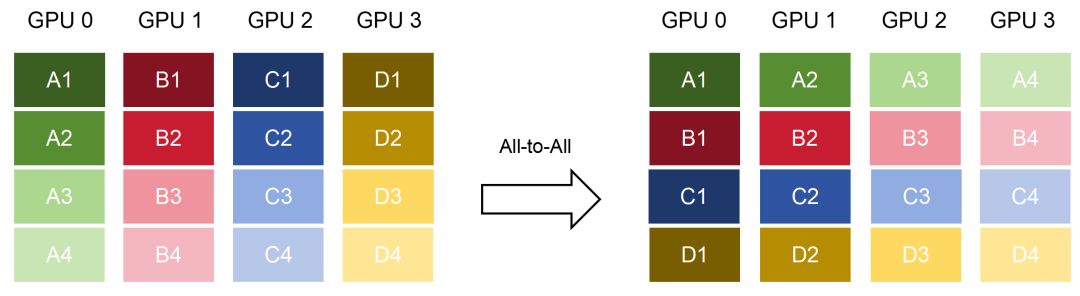 這種改善有何實際意義?以AI模型的分布式訓練場景為例:各個GPU節(jié)點需要頻繁地同步梯度參數(shù)(All-Reduce過程),這正是最考驗通信效率的環(huán)節(jié),而在樣本分片重分配等場景中,All-to-All 過程同樣對通信鏈路有著強需求。如果機頭CPU能提供更高的聚合帶寬,能讓數(shù)據(jù)匯總和分發(fā)的速度更快,就可縮短訓練的單步迭代時間,加速整個訓練進程。