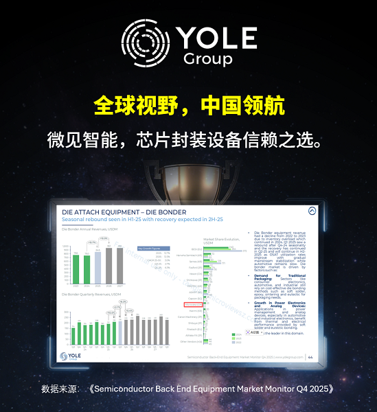 微見智能成立于2019年,聚焦高精度復雜工藝芯片封裝設備研發(fā)與制造,堅定推行“產品領先、效率驅動、全球市場”三大核心戰(zhàn)略。近年來,微見智能產研能力持續(xù)躍升:四期交付中心已完成擴產,固晶機年產能提升至1200臺,標準設備交貨周期縮短20%以上;目前,微見智能固晶機已實現(xiàn)批量出口,是少數(shù)能與國際巨頭正面競爭的國產高端封裝裝備廠商——在全球權威半導體行業(yè)媒體Yole集團的報告中,微見智能作為中國芯片封裝設備供應商受到持續(xù)關注與認可。