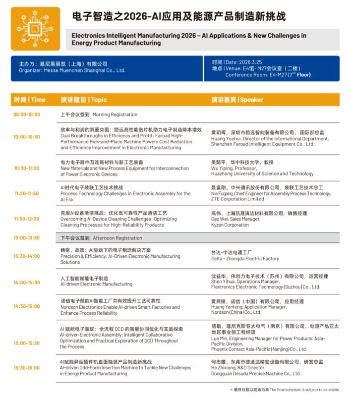 2026慕尼黑上海電子生產(chǎn)設(shè)備展(productronica Shanghai)將在2026年3月25至27日,上海新國(guó)際博覽中心(E1-E5, W1-W4館)盛大舉辦。作為電子制造行業(yè)重要的展示與交流平臺(tái),本屆展會(huì)以近100,000平方米展示面積、超1,100家參展企業(yè)的規(guī)模,聚焦汽車、工業(yè)、通訊電子、醫(yī)療電子等多領(lǐng)域需求,旨在為行業(yè)呈現(xiàn)一場(chǎng)覆蓋電子生產(chǎn)全產(chǎn)業(yè)鏈的“創(chuàng)新盛宴”,重點(diǎn)聚焦智慧工廠、新能源汽車技術(shù)及數(shù)字化未來(lái)。
