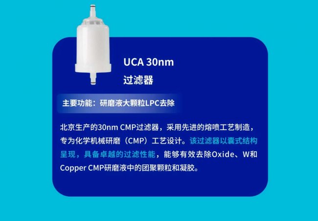 專為CMP場景設計的UCA 30nm過濾器采用熔噴工藝制造,精準去除Oxide、W和Copper CMP研磨液中的團聚顆粒與凝膠。這款產(chǎn)品的意義不僅在于提升研磨液純度,更在于幫助客戶將工藝缺陷率壓降至可控水平,讓先進制程中的晶圓平坦化工藝擁有更穩(wěn)定的工作基礎。