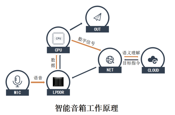 先簡單了解一下智能音箱提供內(nèi)容和服務(wù)的工作原理:例如向智能音響說一段話,麥克風(fēng)錄制語音,存儲在LPDDR中,CPU從LPDDR讀取數(shù)據(jù),然后將處理后的數(shù)字信號通過網(wǎng)絡(luò)上傳至云端服務(wù)器;云端服務(wù)器將進行語音數(shù)字編碼識別和語義理解,隨后將在云端得到的目標(biāo)指令再通過網(wǎng)絡(luò)傳遞給智能音箱存儲在LPDDR中,CPU再從LPDDR中讀取數(shù)據(jù),執(zhí)行相應(yīng)的指令。