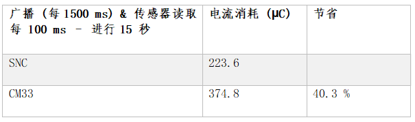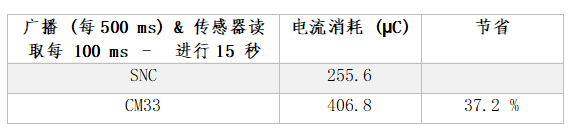 表3:每1500毫秒進(jìn)行廣播時(shí)的能耗,使用SPI每100毫秒進(jìn)行一次傳感器讀取