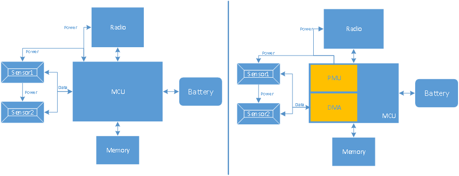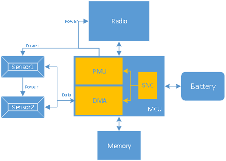 在具有多個(gè)傳感器的更復(fù)雜的基于微控制器的架構(gòu)中,在硬件中集成了智能,用來(lái)控制各種子系統(tǒng)。例如,從傳感器到存儲(chǔ)器傳輸數(shù)據(jù)耗時(shí)又耗電,這一部分工作其實(shí)可以從處理器轉(zhuǎn)移到直接內(nèi)存存?。―MA)單元。電源管理單元(PMU)還可以被編程為對(duì)特定事件做出反應(yīng)并關(guān)閉各種子系統(tǒng),例如外設(shè)、傳感器和無(wú)線電。