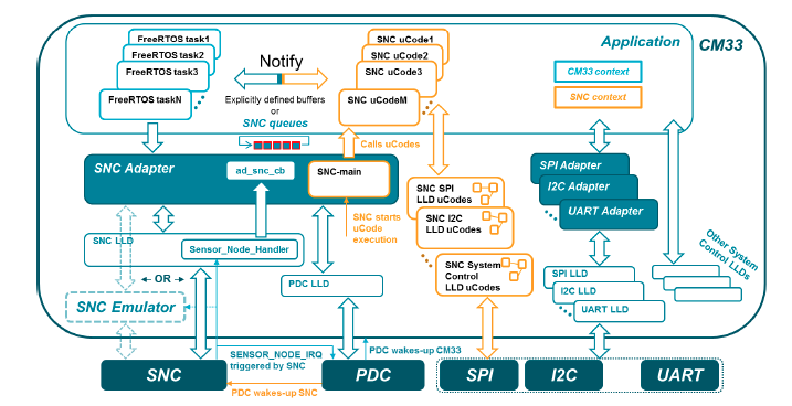 • SNC適配器向DA1469x系統(tǒng)注冊(cè)或注銷SNC微碼,從而創(chuàng)建一列SNC微碼,每個(gè)微碼由特定PMU事件觸發(fā)。